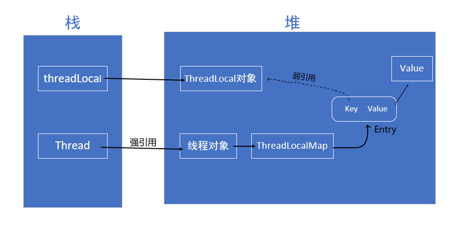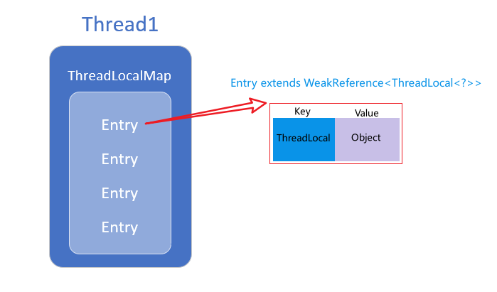 前面讲到 ThreadLocalMap,本质上是一个 Entry[] 数组, 一个 Entry通过弱引用关联当前 ThreadLocal对象, 通过强引用 Value保存设置的值。
